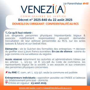🔹 Objet : confidentialité de l’adresse personnelle des dirigeants personnes physiques (représentants légaux & associés indéfiniment responsables) au RCS, sur les actes (passés & futurs) et l’extrait K/Kbis.
